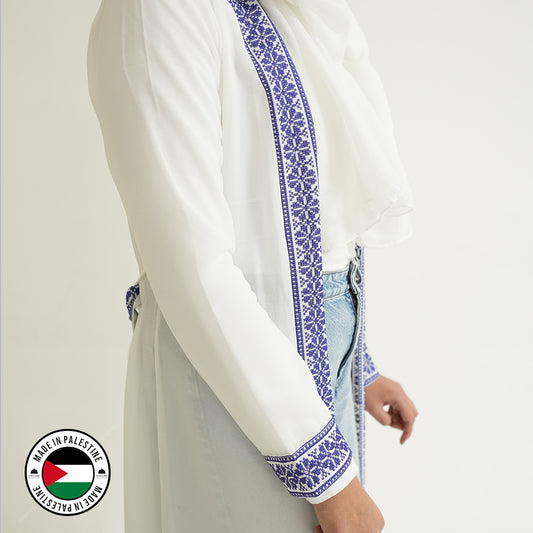 Palestinian Open Tatreez Abaya (White and Blue)