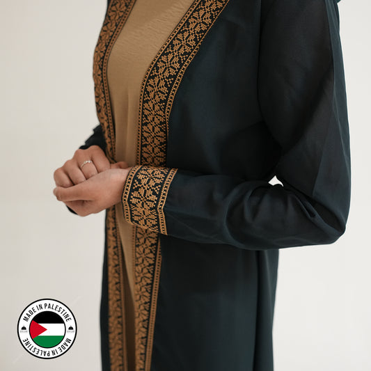 Palestinian Open Tatreez Abaya (Green and Gold)