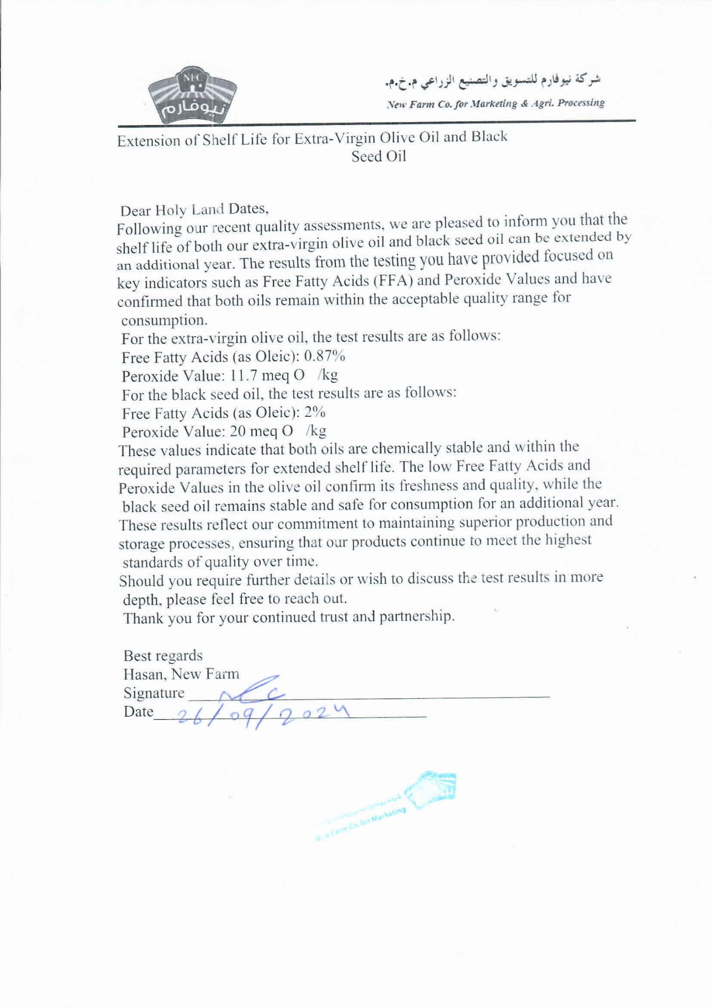 Our Black Seed Oil has been thoroughly tested to ensure its quality and safety. Based on the results, its shelf life has been extended, with a new expiry date of 2nd January 2026. We take pride in maintaining the highest standards for our products. Please see the attached certificate from our trusted supplier in Ramallah, Palestine, for full details.